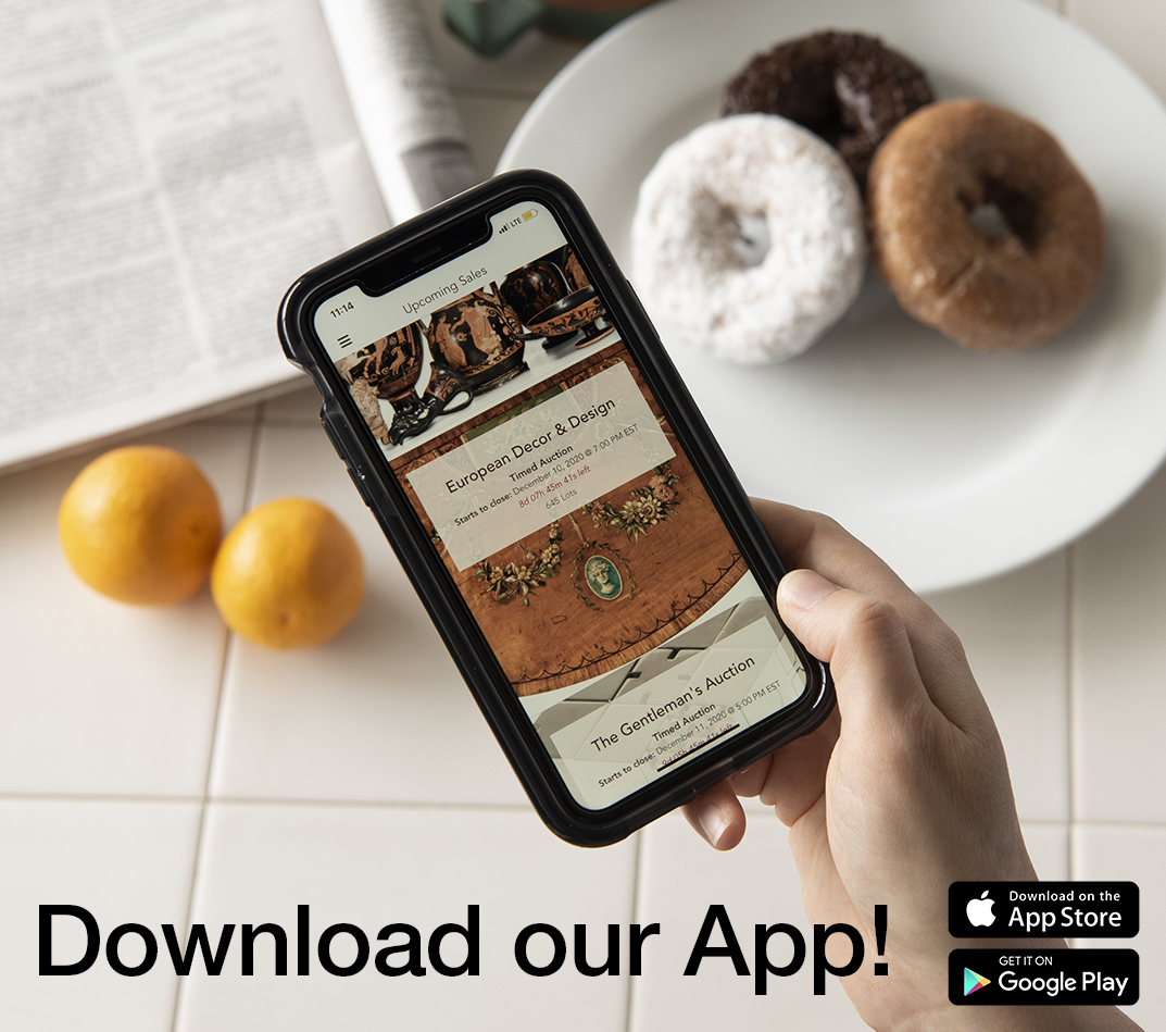 Download our free app to place bids, view watched lots, and browse upcoming auctions from your mobile phone or tablet. Available on the App Store and Google Play.