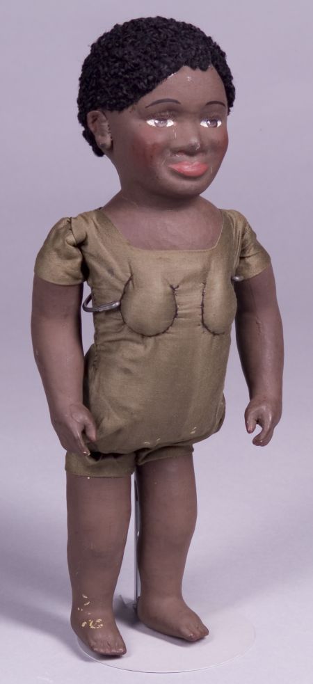 Black Cloth Martha Chase Mammy Doll, Rhode Island, early 20th century, very dark brown painted eyes, soft brick-red painted mouth and nostrils, slightly protruding lower lip, rosy cheek coloring, matte finish to brown paint (light crazing on neck and face with a few very fine white lines showing on face, small nose rub may have paint touch-in), black astrakhan wig, brown cotton sateen-covered body with stitched and padded bosom delineation, painted limbs from above elbows and knees (some light soil marks may be paint from the factory), unclothed, ht. 17 in.
