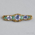 Arts & Crafts 18kt Gold Gem-set Brooch, Tiffany & Co., set with three cushion-cut sapphires flanked by step-cut emeralds all within scrolling foliate devices, lg. 2 5/16 in., signed, (losses).